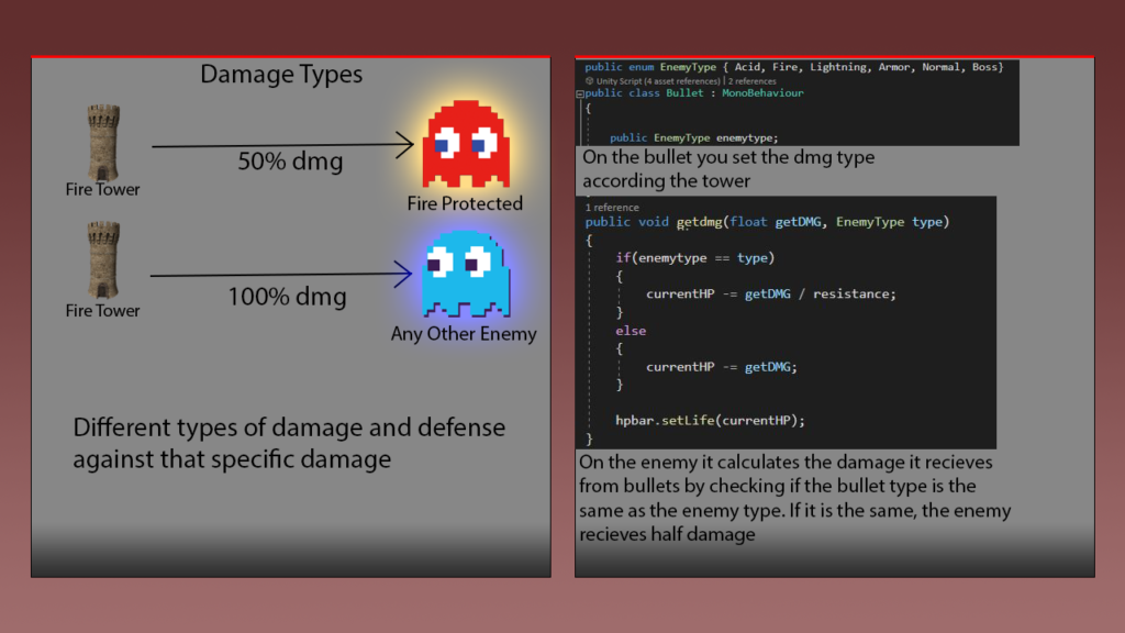 In mijn game heb ik als main feature verschillende damage types gecreëerd. Ik wilde dat de enemies wat moeilijker dood te krijgen zijn en dan niet door middel van meer health, maar meer moeite om die health die ze hebben te kunnen beschadigen.